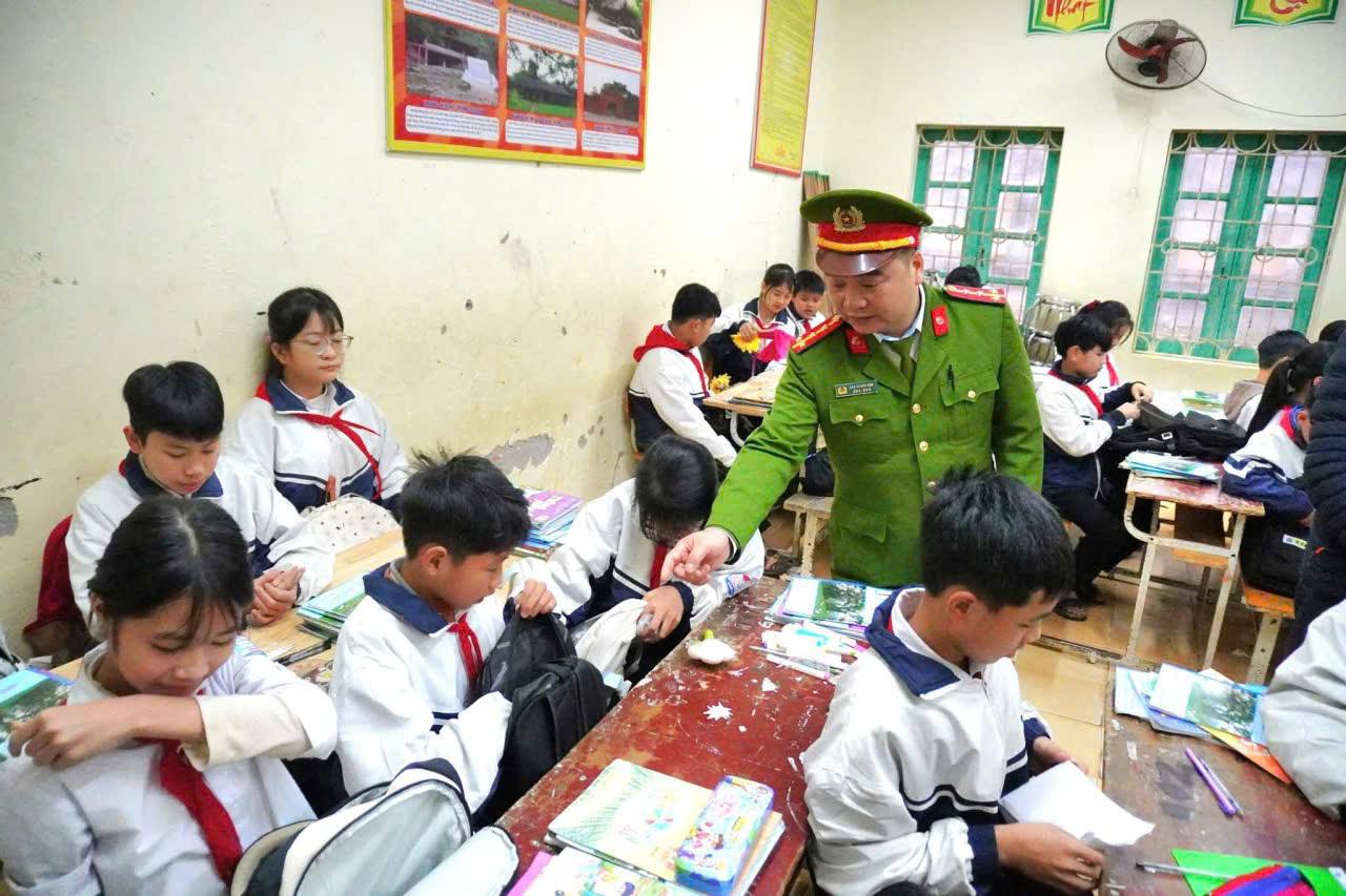 Công an xã Bình Ca kiểm tra đồ dùng học tập của học sinh tại các trường THCS trên địa bàn xã.