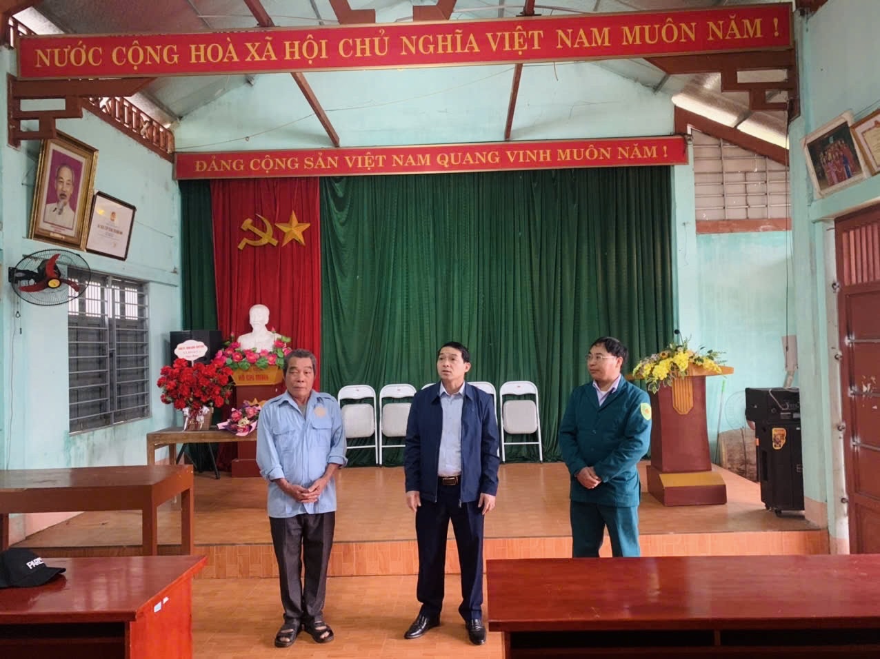 Đồng chí Dương Văn Hòa, Bí thư Đảng ủy, Chủ tịch HĐND xã kiểm tra công tác chuẩn bị cơ sở vật chất phục vụ bầu cử tại nhà văn hóa thôn Đồng Trôi