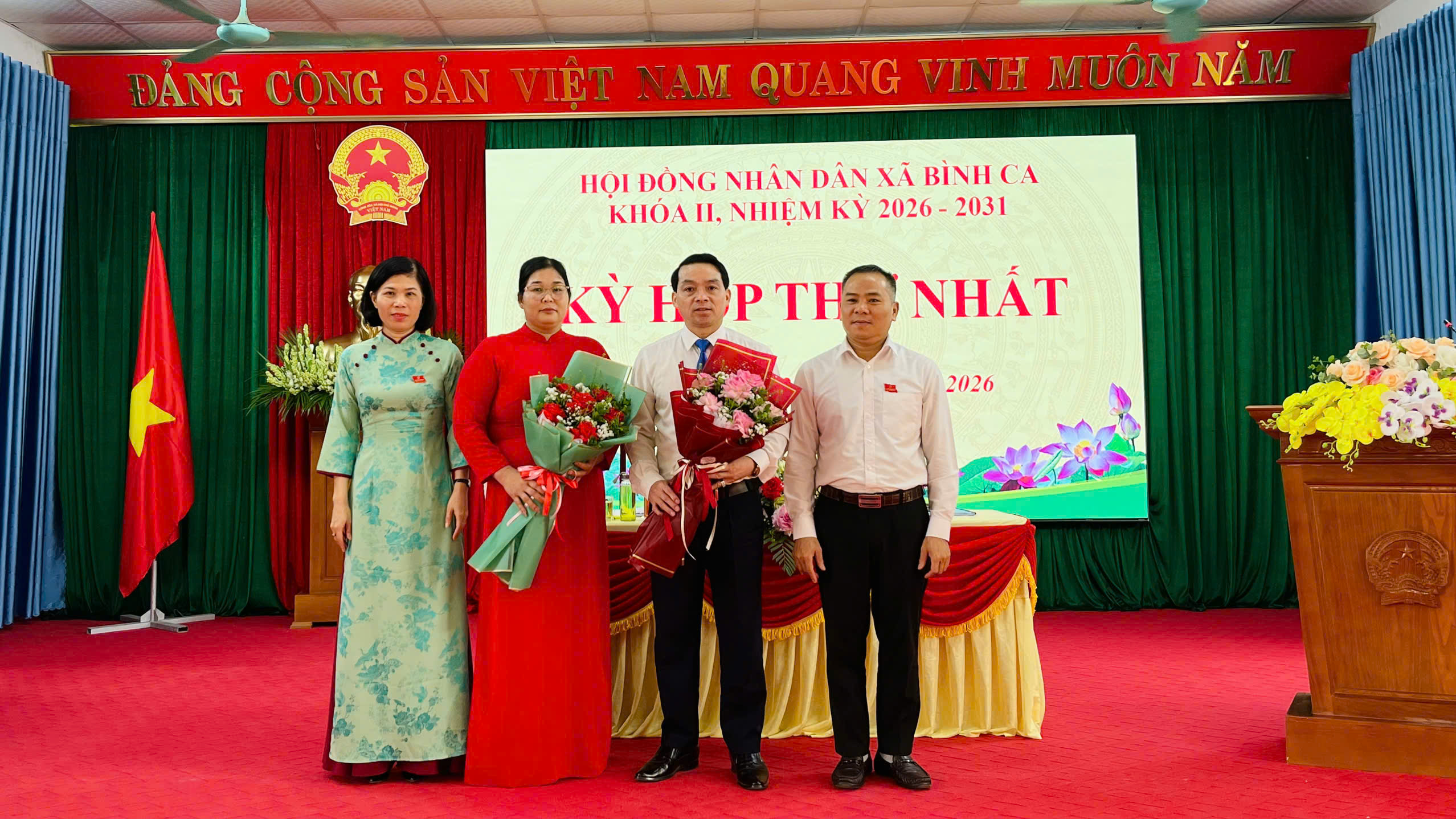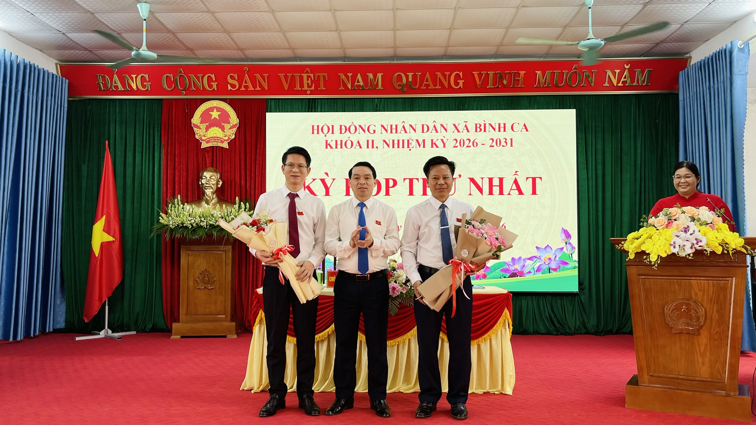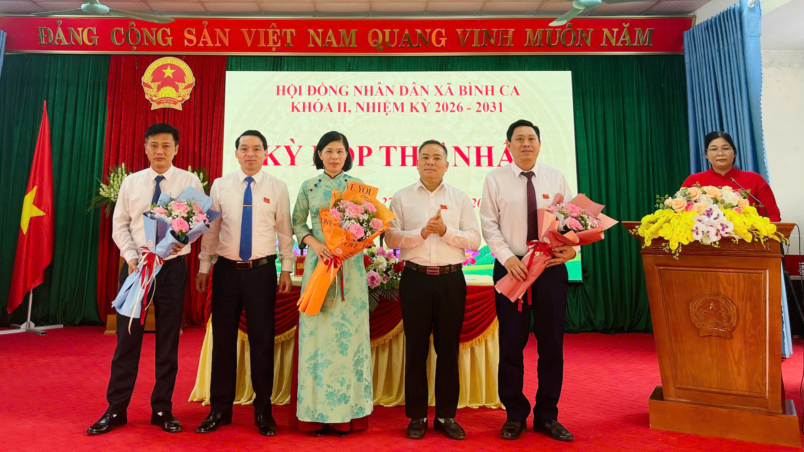 Lãnh đạo xã Bình Ca tặng hoa chúc mừng các đại biểu trúng cử các chức danh HĐND, UBND xã Bình Ca khóa II, nhiệm kỳ 2026 - 2031.