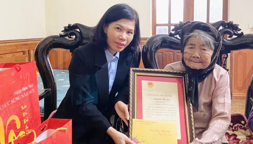 Đồng chí Chủ tịch UBND xã Lưu Thị Lan Hương thăm,tặng quà cụ Nguyễn Thị Lợi 100 tuổi, thôn Vân Thành.