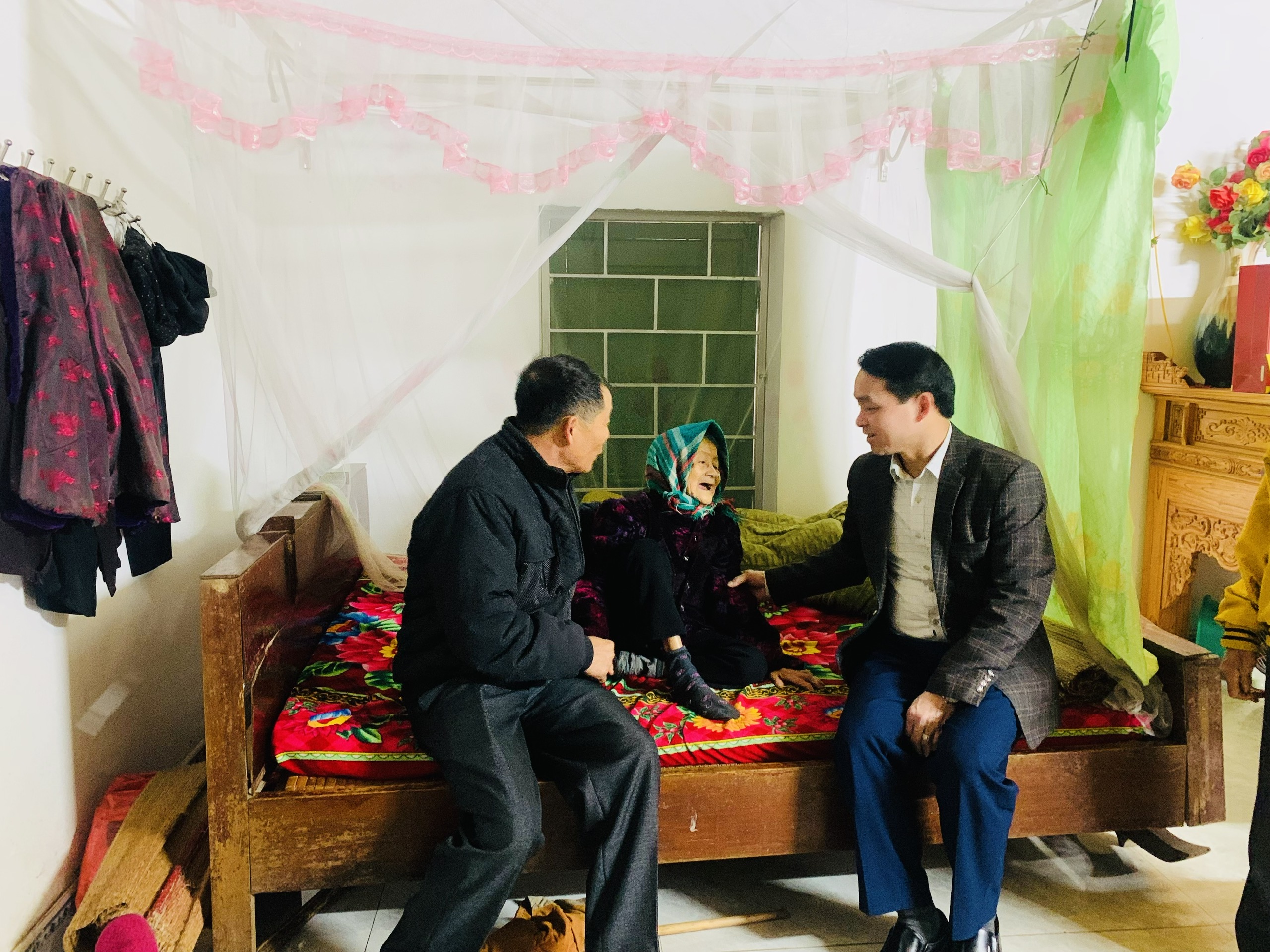 Đồng chí Dương Văn Hòa, Bí thư Đảng ủy, Chủ tịch HĐND xã thăm, tặng quà cụ Lê Thị Thịnh, 109 tuổi, thôn Mắt Rồng.