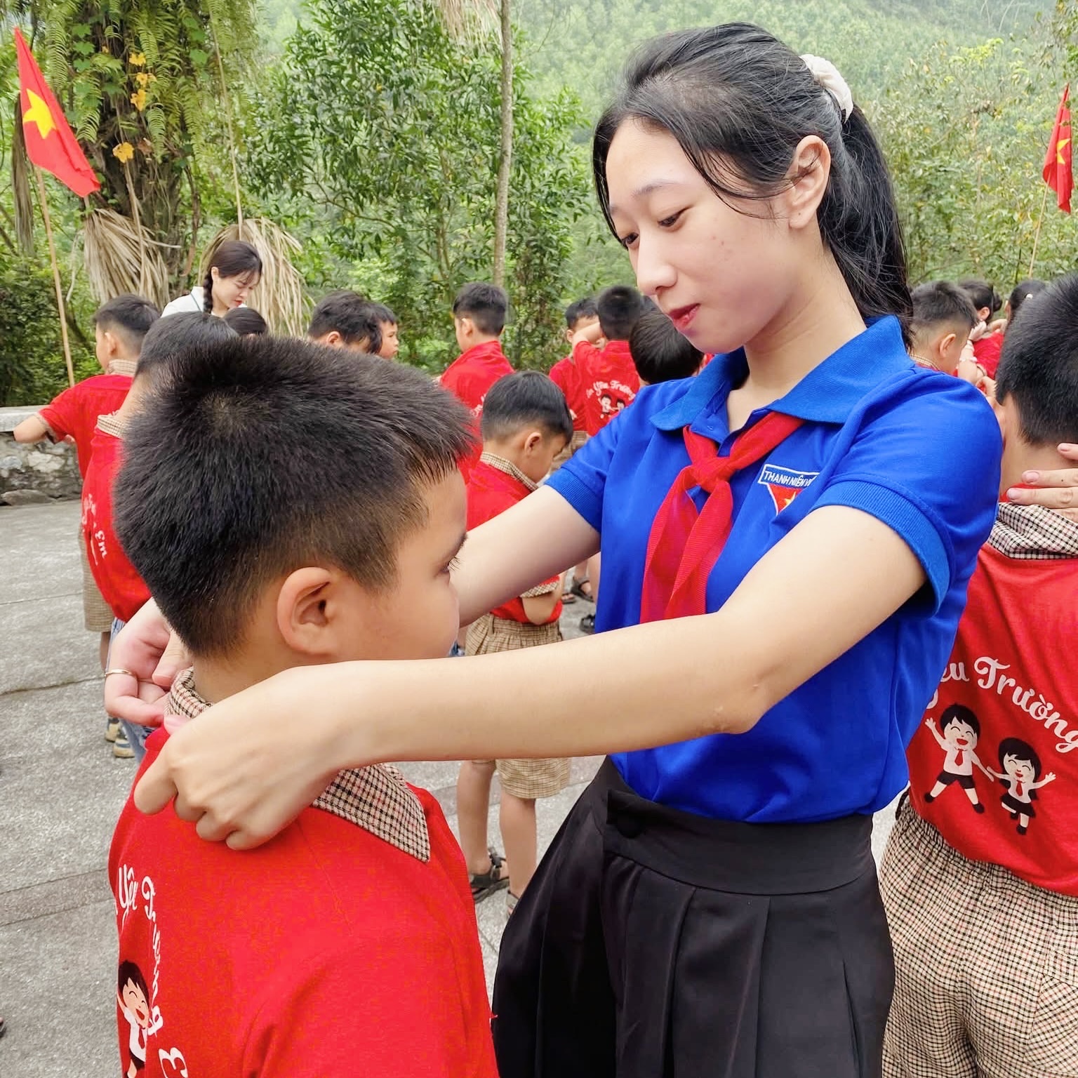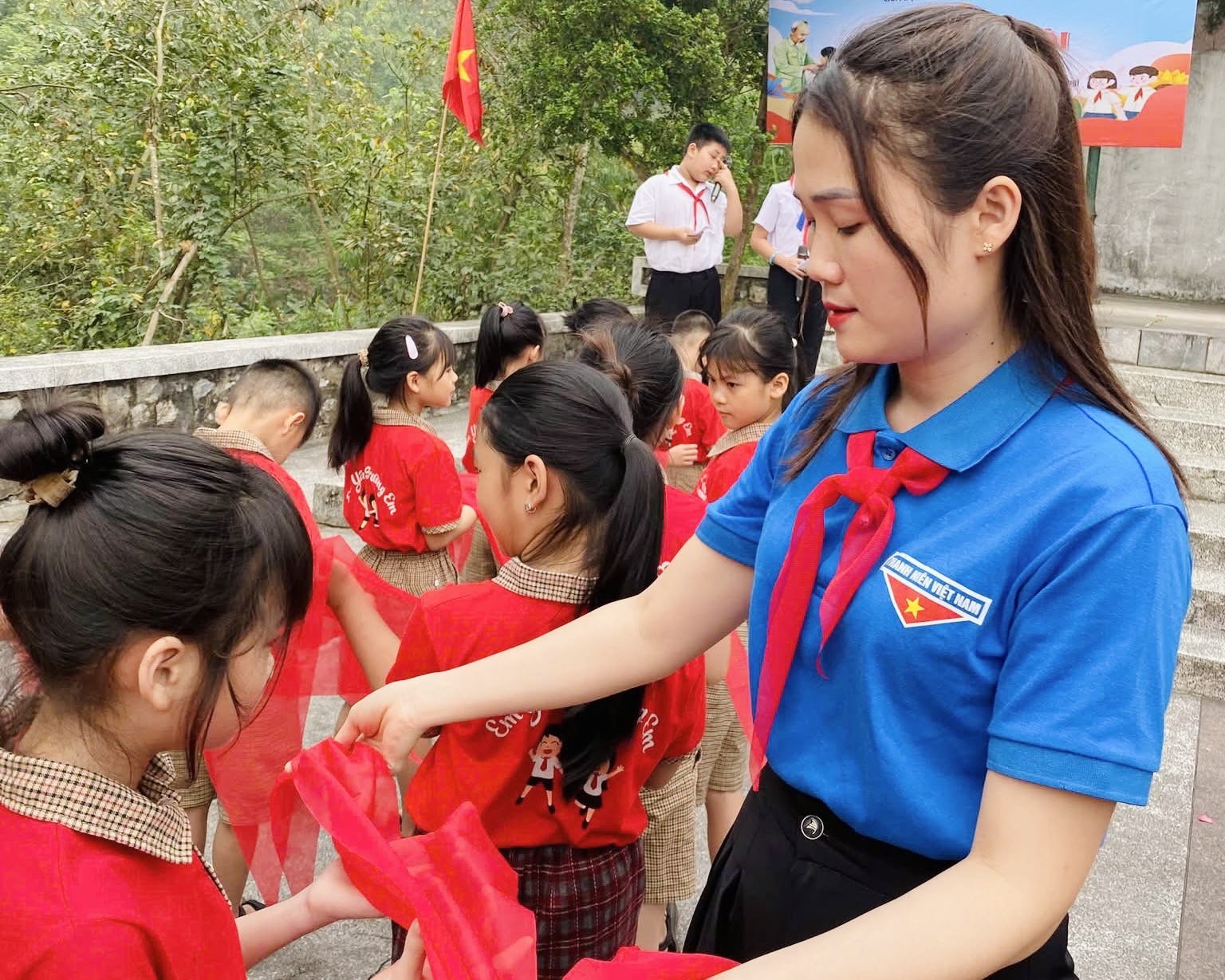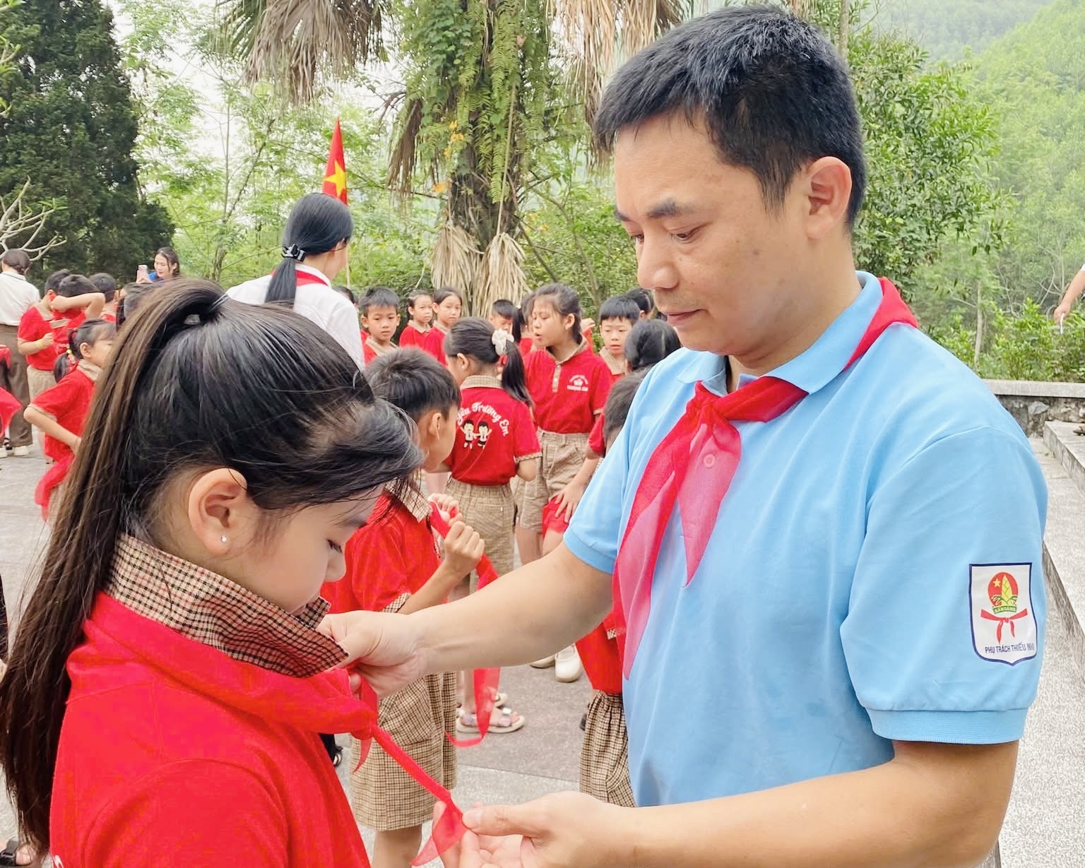 Khoảnh khắc ý nghĩa nhất của buổi lễ là khi các thầy, cô giáo trực tiếp quàng khăn quàng đỏ – biểu tượng thiêng liêng của Đội TNTP Hồ Chí Minh – lên vai các em. Từ giây phút đó, mỗi đội viên mới càng ý thức rõ hơn về trách nhiệm, niềm vinh dự khi được đứng trong hàng ngũ của Đội.