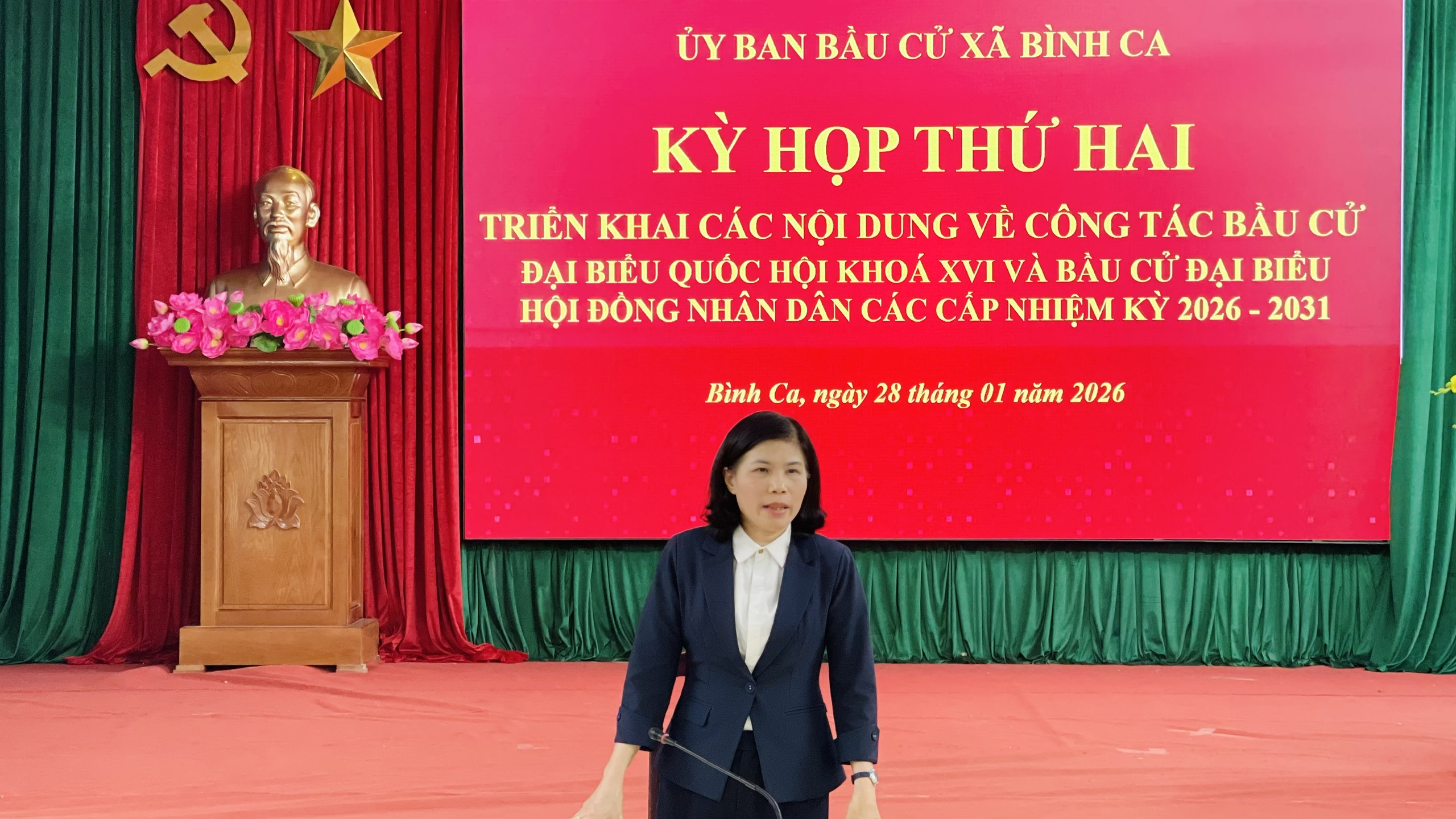 Đồng chí Lưu Thị Lan Hương, Phó Bí thư Đảng ủy, Chủ tịch Ủy ban nhân dân xã, Chủ tịch Ủy ban bầu cử xã chủ trì kỳ họp