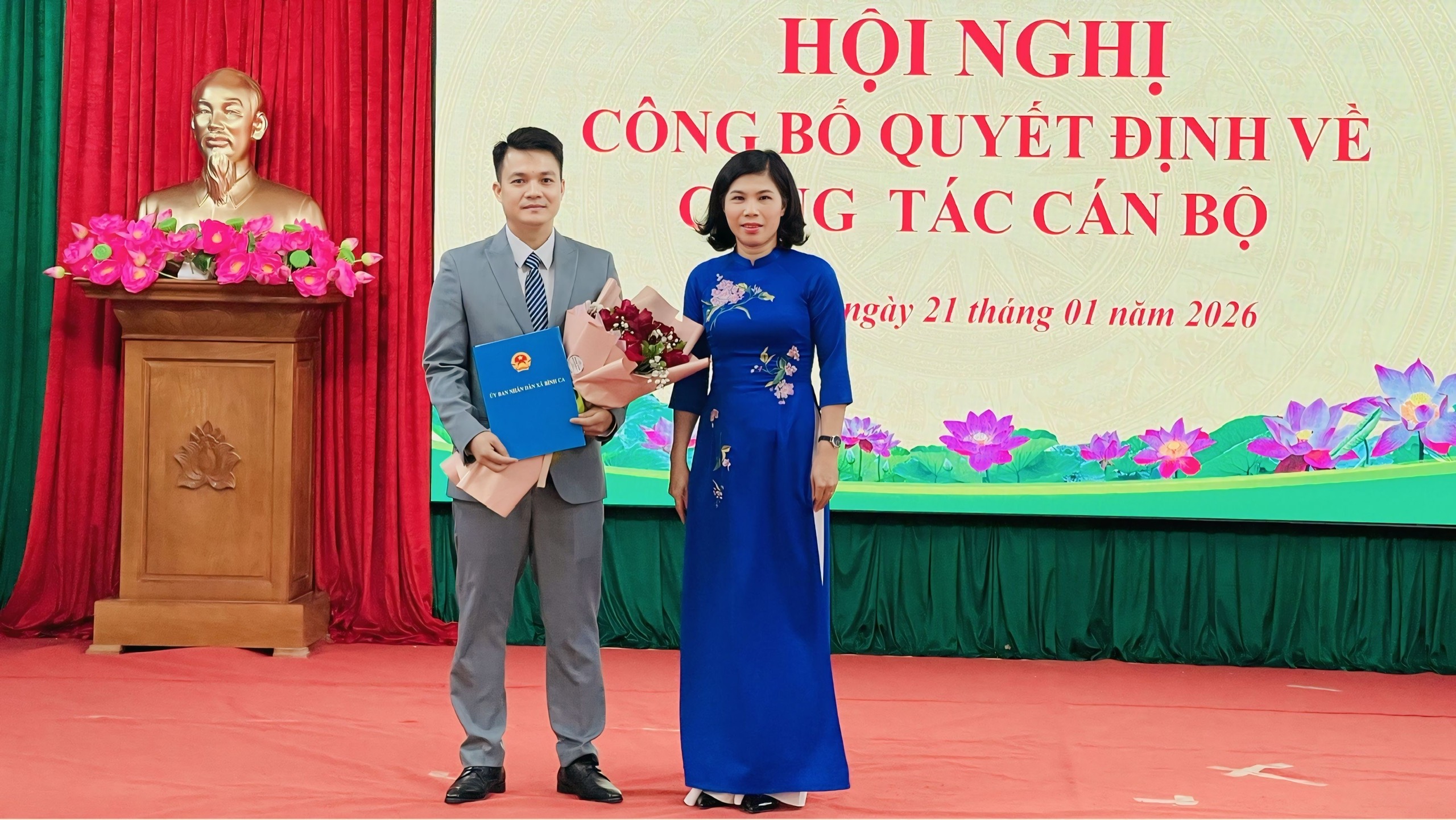 Đồng chí Lưu Thị Lan Hương, Phó Bí thư Đảng ủy, Chủ tịch UBND xã trao quyết định bổ nhiệm đồng chí Phạm Văn Tâm giữ chức vụ Giám đốc Trạm Y tế xã Bình Ca