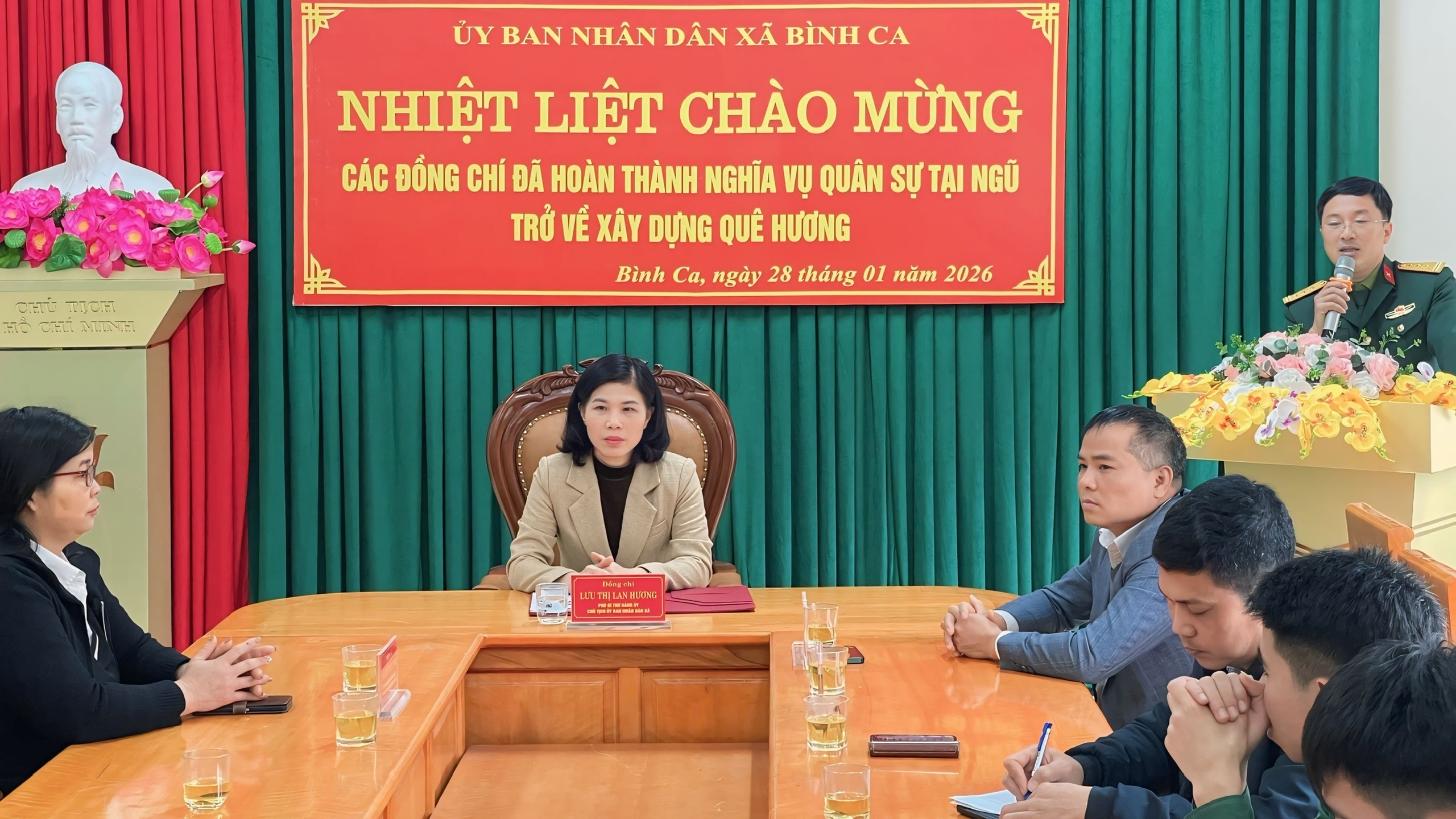 Phát biểu tại buổi lễ đồng chí Chủ tịch UBND xã Lưu Thị Lan Hương bày tỏ niềm vui mừng, phấn khởi chào đón công dân của xã đã hoàn thành nghĩa vụ quân sự trở về địa phương sau 24 tháng tu dưỡng, rèn luyện, phấn đấu trong học tập, công tác, hoàn thành tốt nhiệm vụ mà Đảng, Nhà nước và Quân đội nhân dân giao phó. Đồng chí đề nghị các quân nhân xuất ngũ cần phát huy sức trẻ, xung kích đi đầu trong các hoạt động tại địa phương; Thường xuyên tu dưỡng phẩm chất đạo đức, giữ vững và phát huy phẩm chất “Bộ đội cụ Hồ” trên mặt trận mới, gương mẫu chấp hành và vận động gia đình, nhân dân thực hiện tốt đường lối, chủ trương của Đảng, pháp luật của Nhà nước; Tích cực trong sản xuất, thực hiện có hiệu quả các chương trình phát triển kinh tế - xã hội, xây dựng nông thôn mới, giảm nghèo bền vững. Thường xuyên nêu cao tinh thần cảnh giác cách mạng, đấu tranh phòng chống có hiệu quả các luận điệu tuyên truyền phá hoại của các thế lực thù địch tại nơi cư trú. Đồng thời tuyên truyền, giáo dục cho thế hệ trẻ luôn sẵn sàng lên đường nhập ngũ, thực hiện nghĩa vụ thiêng liêng của công dân, thật sự xứng đáng với lòng tin của cấp ủy, chính quyền và nhân dân.