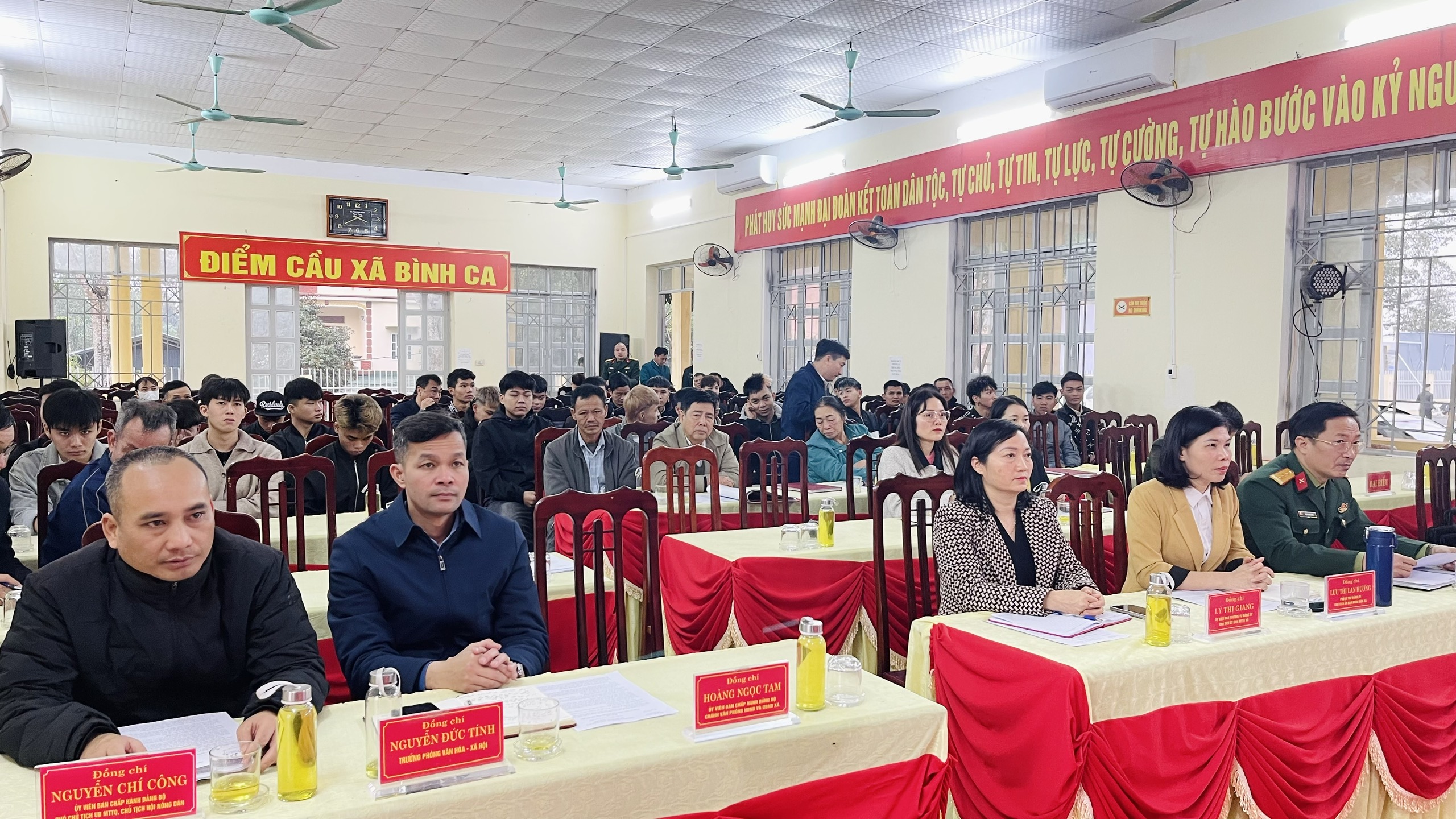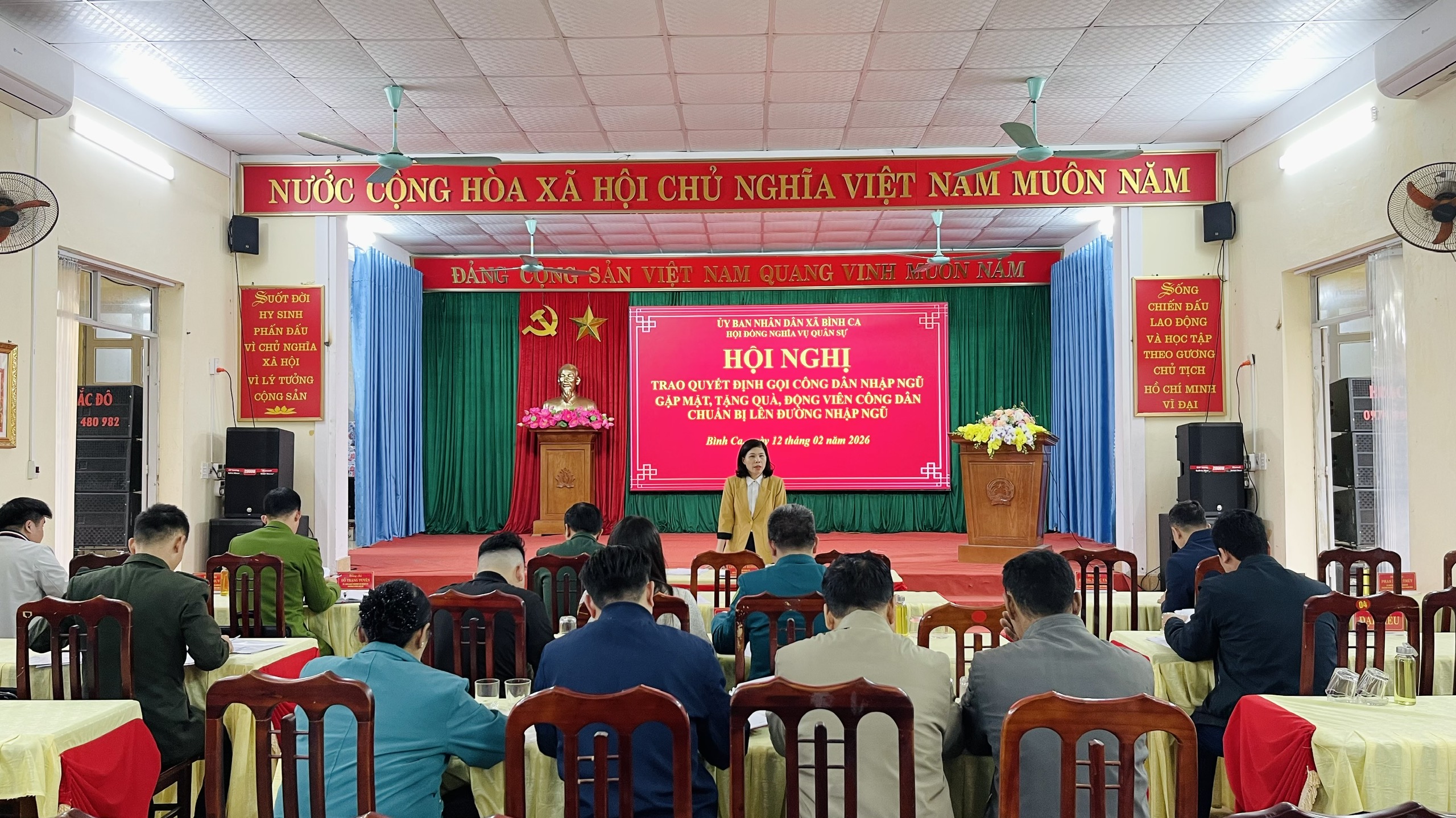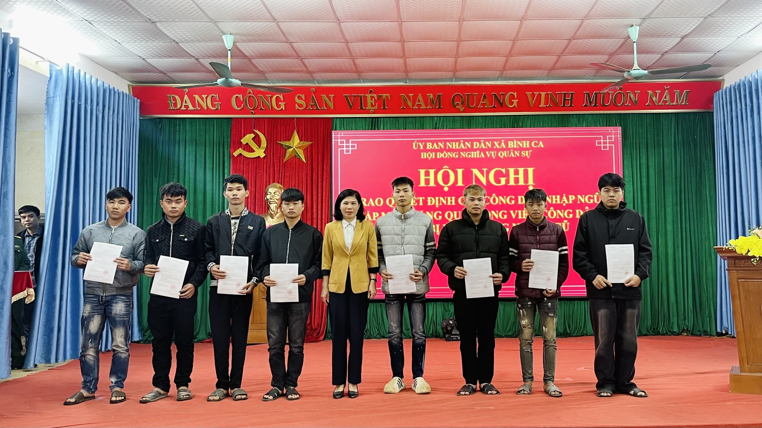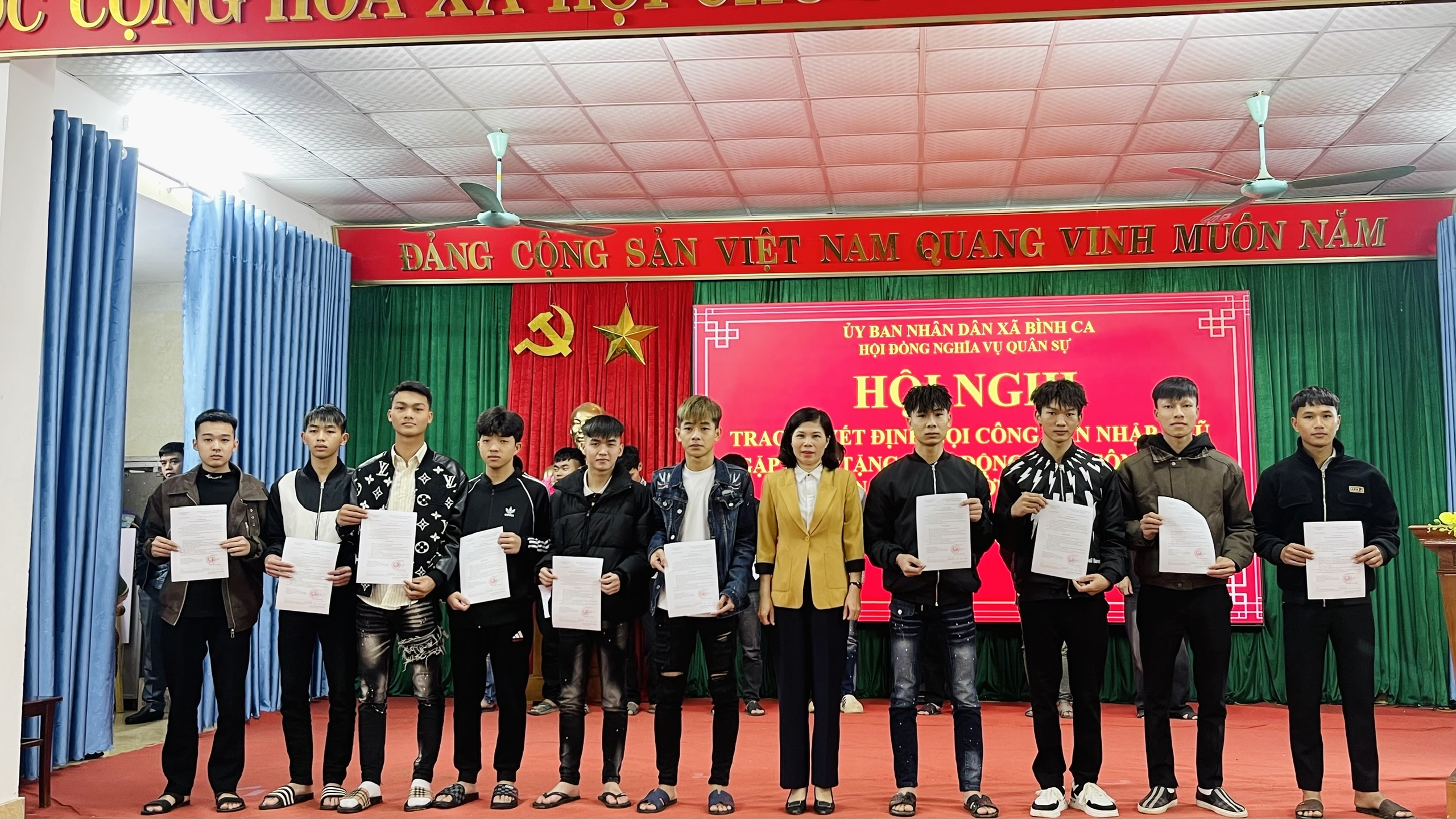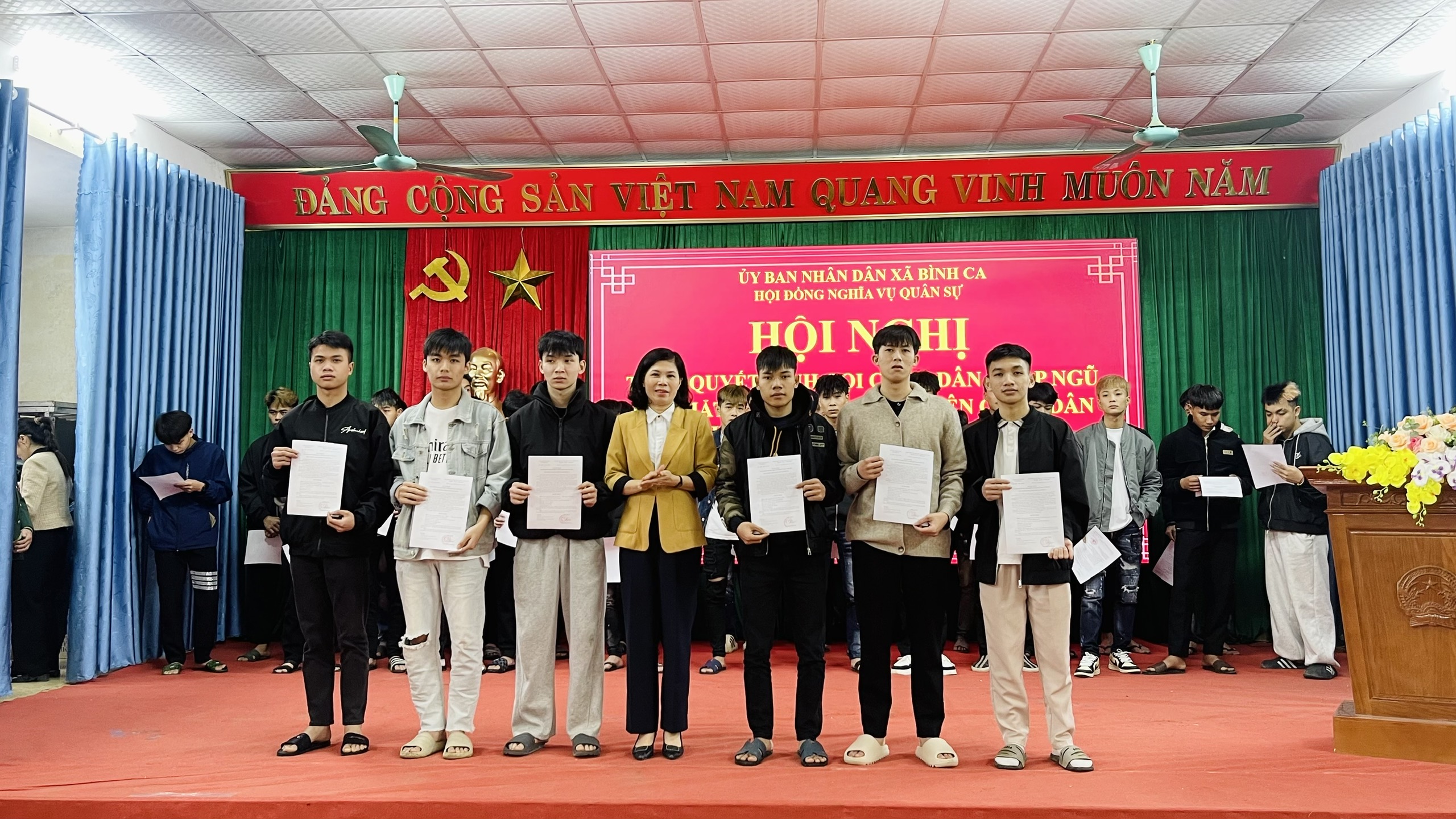 Tại hội nghị, lãnh đạo Văn phòng HĐND – UBND xã đã công bố Quyết định của Chủ tịch UBND tỉnh về việc gọi công dân nhập ngũ năm 2026 và danh sách công dân của xã Bình Ca đủ điều kiện lên đường thực hiện nghĩa vụ quân sự và nghĩa vụ Công an nhân dân. Đồng chí Chủ tịch UBND xã Lưu Thị Lan Hương đã trực tiếp trao lệnh gọi nhập ngũ cho các công dân, động viên tinh thần, thể hiện sự quan tâm của cấp ủy, chính quyền địa phương đối với thế hệ trẻ chuẩn bị lên đường bảo vệ Tổ quốc.